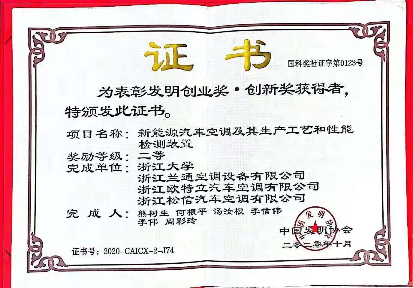 浙江歐特立汽車空調有限公司榮獲團體二等獎